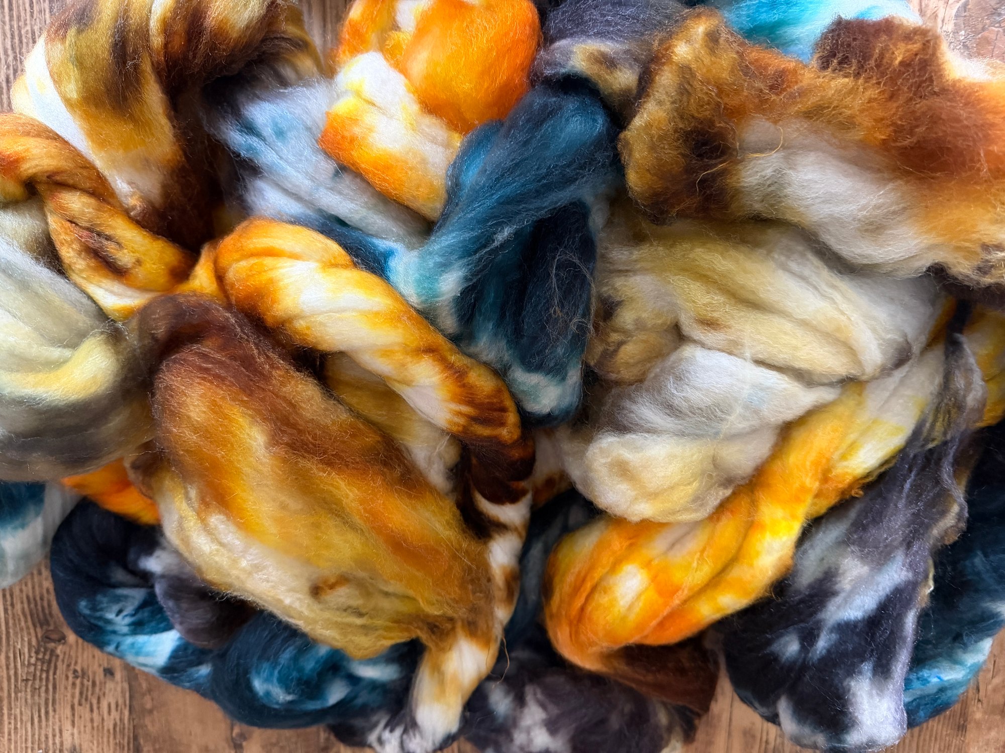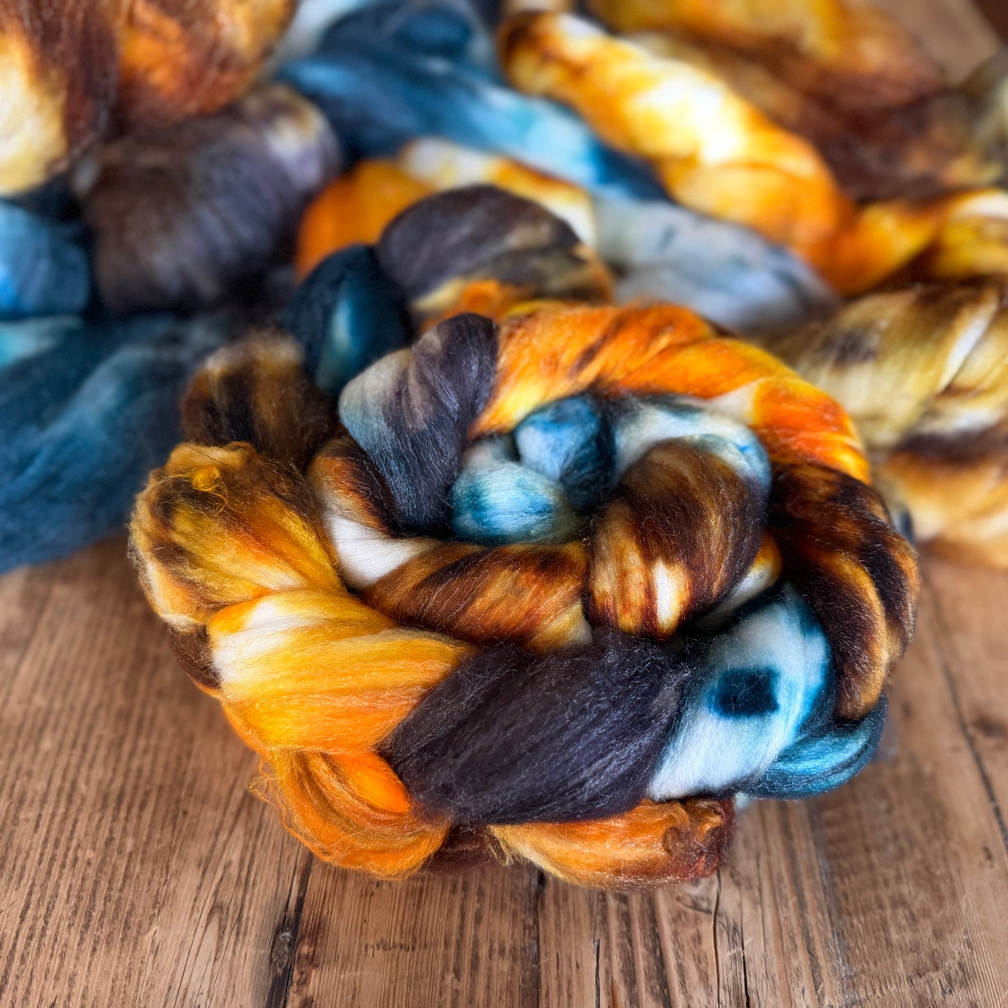 This fiber is hand dyed with professional dyes in a smoke-free environment. This wool is superwash, however I recommend washing your finished yarn with wool wash and cold water. Minimal color bleeding might occur during the first soak.