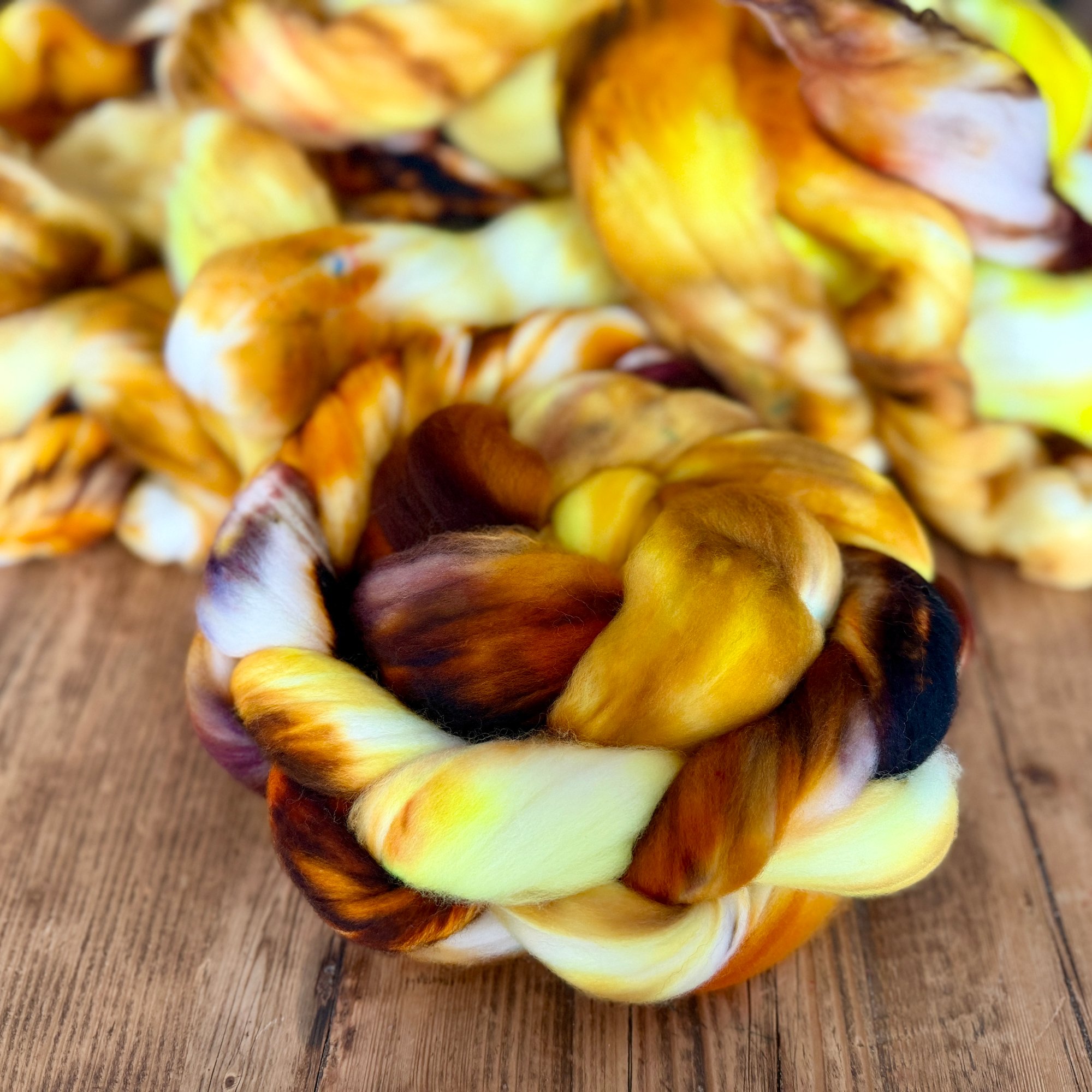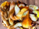 This fiber is hand dyed with professional dyes in a smoke-free environment. This wool is superwash, however I recommend washing your finished yarn with wool wash and cold water. Minimal color bleeding might occur during the first soak.