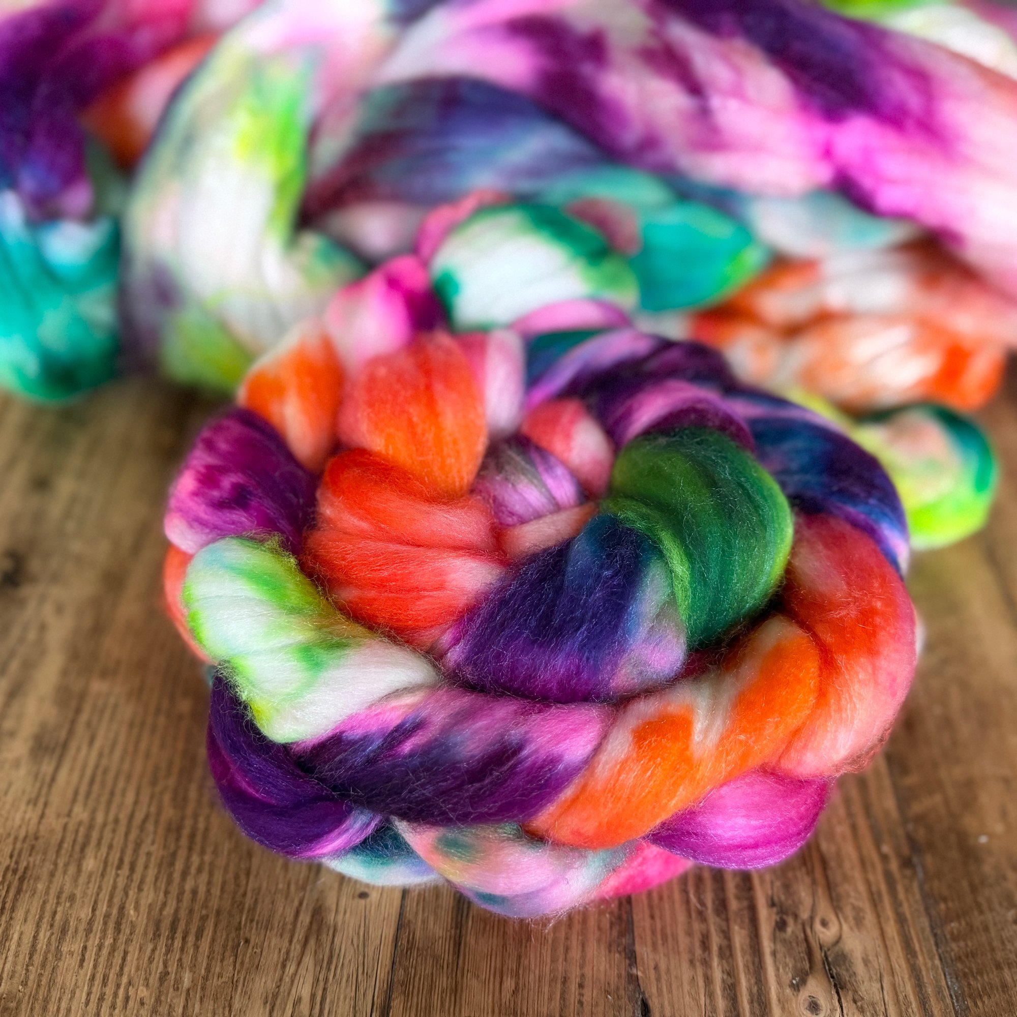 This fiber is hand dyed with professional dyes in a smoke-free environment. This wool is superwash, however I recommend washing your finished yarn with wool wash and cold water. Minimal color bleeding might occur during the first soak.