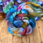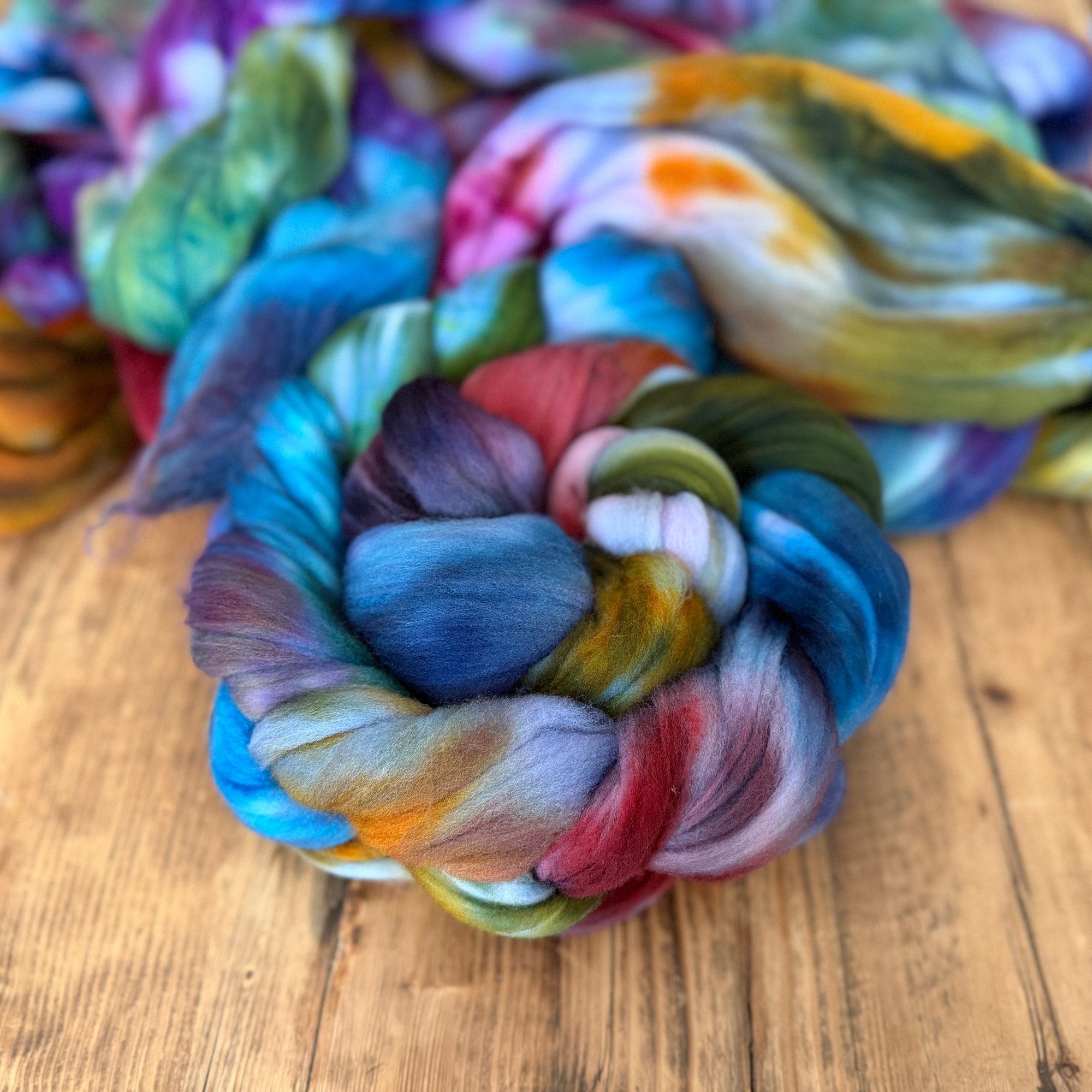 This fiber is hand dyed with professional dyes in a smoke-free environment. This wool is superwash, however I recommend washing your finished yarn with wool wash and cold water. Minimal color bleeding might occur during the first soak.