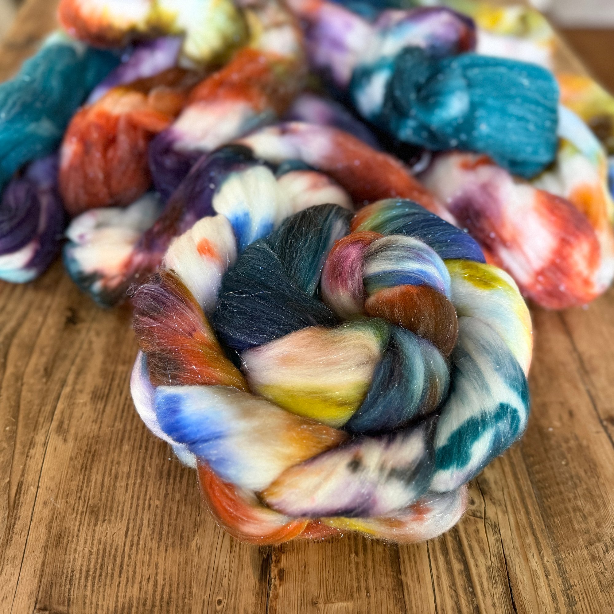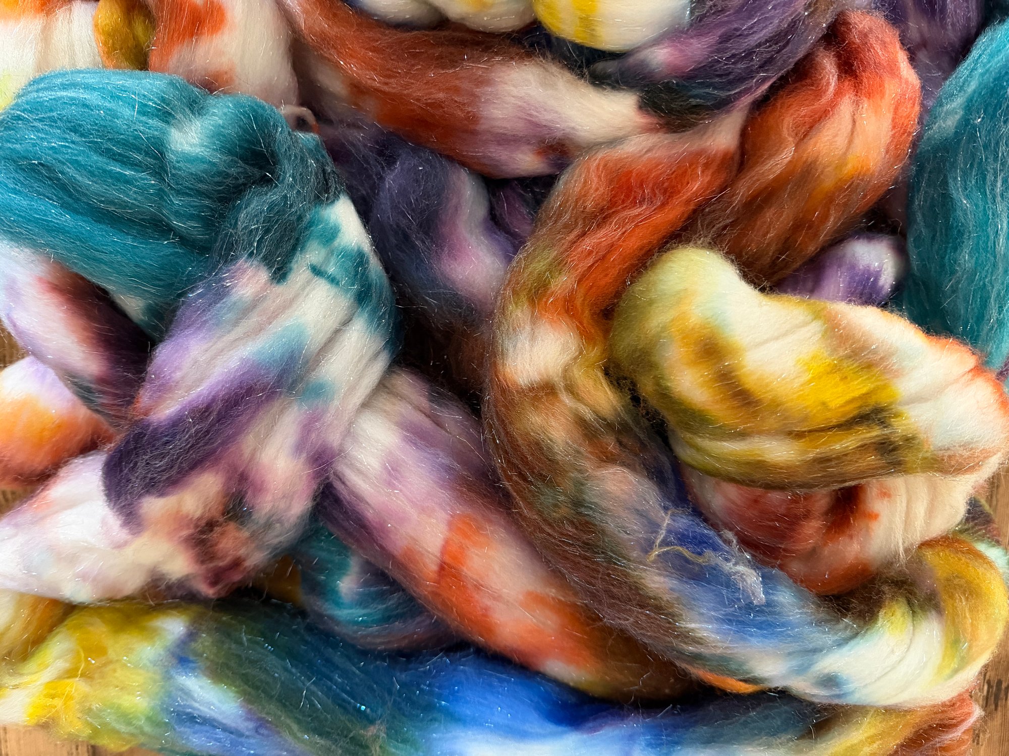 This fiber is hand dyed with professional dyes in a smoke-free environment. This wool is superwash, however I recommend washing your finished yarn with wool wash and cold water. Minimal color bleeding might occur during the first soak.